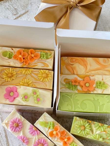 Indulge in our beautifully curated Floral Soap Trio — a set of three individually packaged soap bars, each topped with delicate handmade soap flowers for an elegant touch. This set includes our most beloved fragrances: